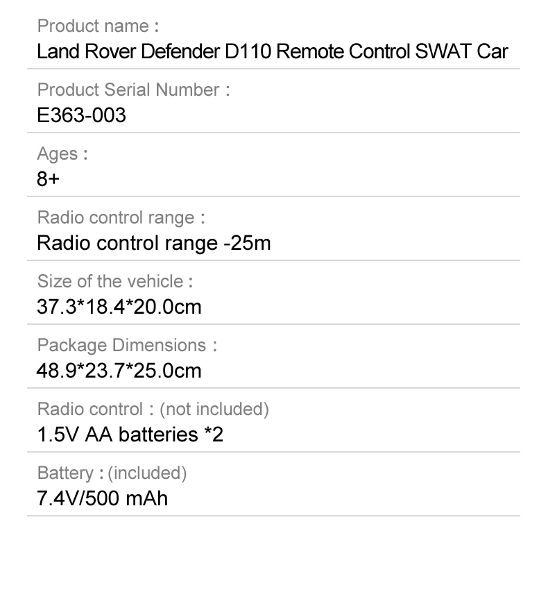 Masinuta cu telecomanda Land Rover Defender D110 SWAT 1:14 de la Double E  are o caroserie neagra și 4 roți mari de cauciuc moale. Masinuta se poate conduce inainte, inapoi si stanga/dreapta. Este echipat cu efecte de sunet si lumina controlate de pe telecomanda inclusa. Masinuta este cu siguranta cadoul perfect pentru copii carora le plac masinile de interventie cu telecomanda.